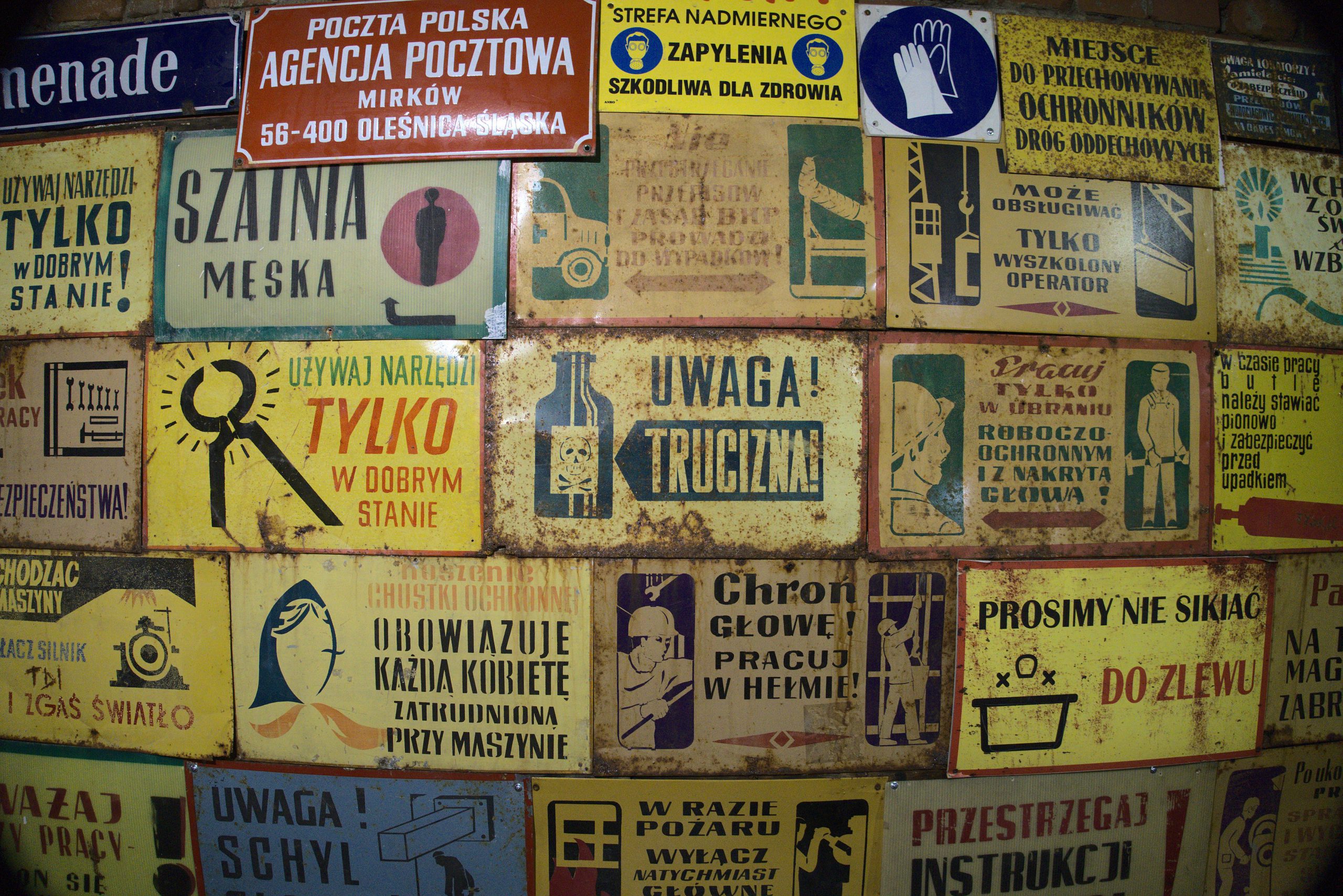 Obejrzeć można również kolekcję tabliczek ostrzegawczych. Niektóre z nich okazały się prorocze: „Oszczędzaj zdrowie – pracuj w masce”. Inne niekoniecznie wiązały się z wydobyciem złota czy innego surowca: „Rolniku, nie myj jaj przed skupem”, „Porządek powinien brać przykład z bałaganu i robić się sam”, „Prosimy nie sikać do zlewu” czy „Towar macany należy do macanta”.