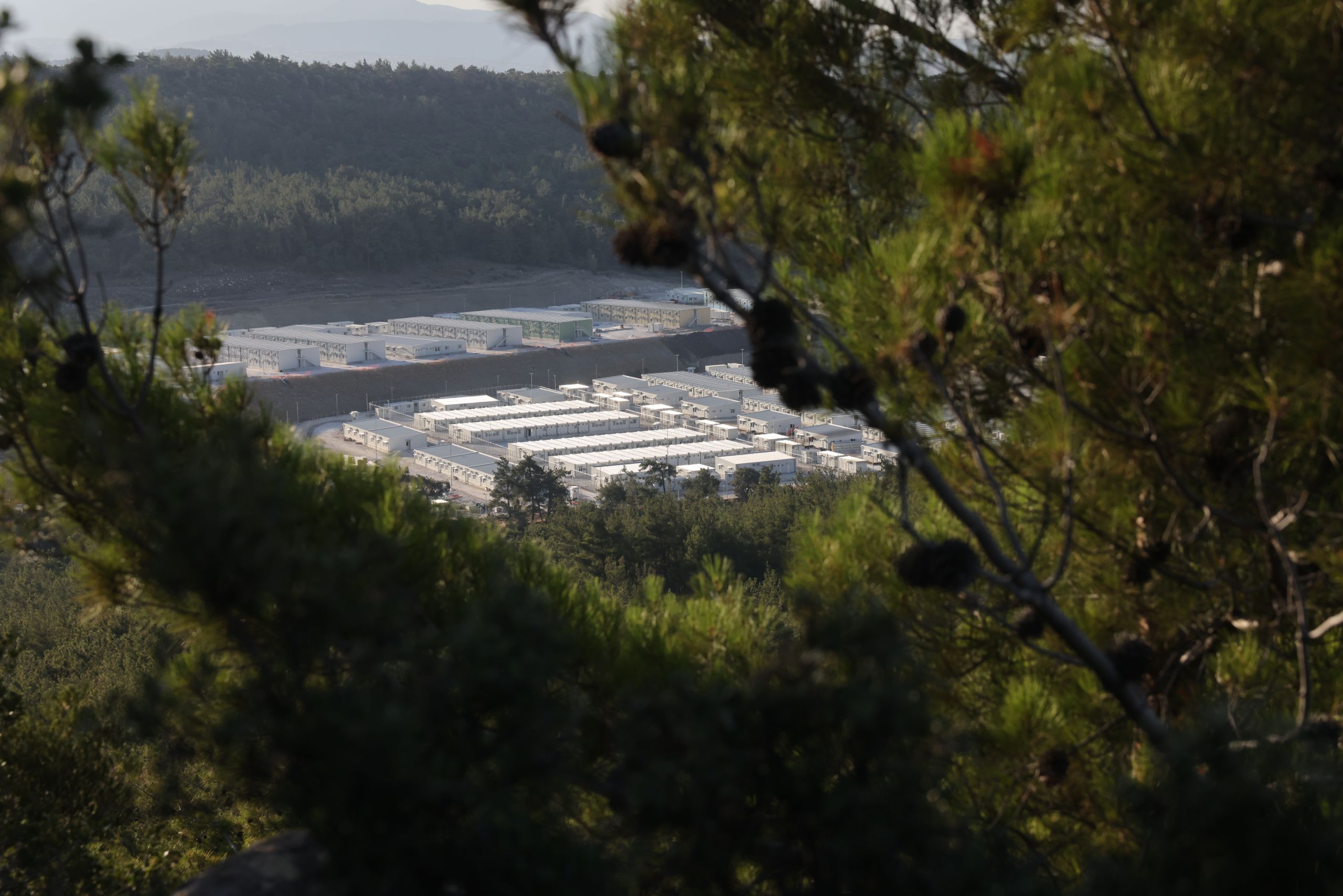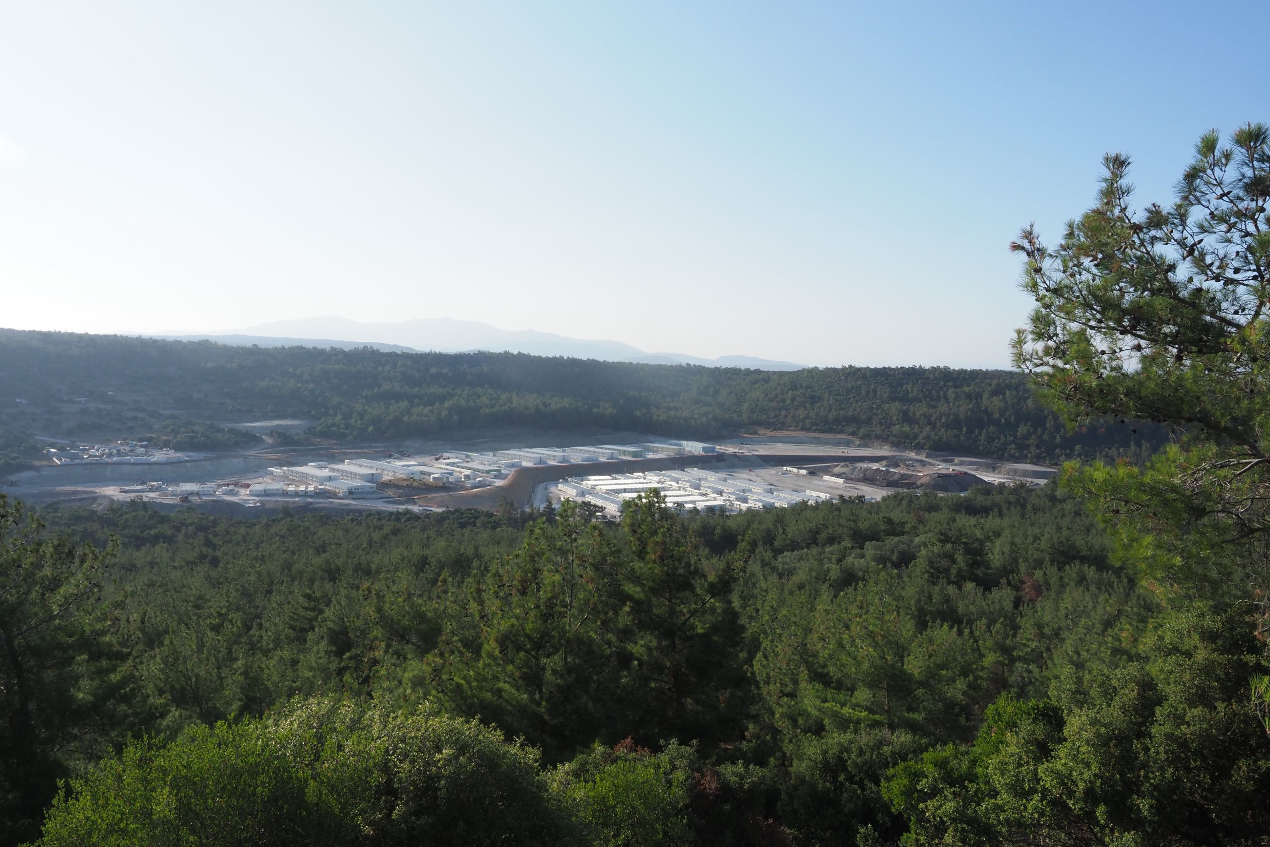 Panorama uchwycona przez drona w Mavrovouni na wyspie Lesbos w sierpniu 2023 r. pokazuje wpływ przemysłu kontroli migracji, który jest dotyczy nie tylko ludzki, ale także środowiska. W tym przypadku nie jest to jeden mur, ale kilka murów, które graniczą z nowym Zamkniętym Centrum o Kontrolowanym Dostępie na Lesbos, zbudowanym po zniszczeniu Centrum Przyjmowania i Identyfikacji w Morii w wyniku pożaru we wrześniu 2020 r. Lokalni ekolodzy ostrzegają, że ta nowy obiekt, zaprojektowany dla 3000 osób w sercu największego lasu sosnowego na Morzu Egejskim w Grecji, może spowodować poważne szkody na tysiącach hektarów dziewiczego lasu, w przypadku wybuchu pożaru.