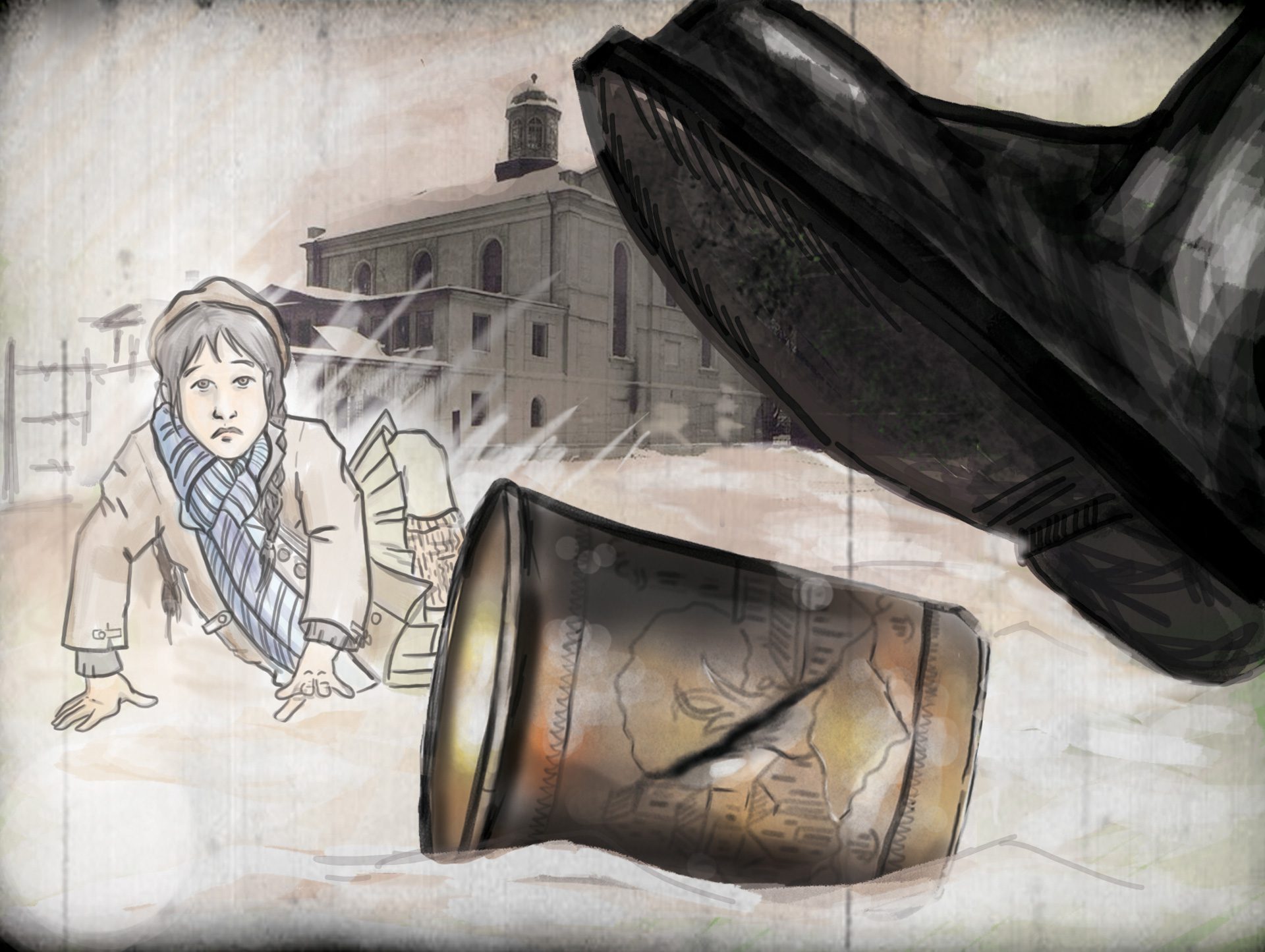 Pani Janina kontynuuje swoją opowieść: – Żydowskie książki i mniej cenne rzeczy kazali zapakować na wozy. Przy tym pracowali Żydzi z getta, a woźnicami byli Polacy. Załadowane wozy nie pojechały daleko. Dojechały do Babinki. Tam zaczęto te wszystkie rzeczy wrzucać do wody. Takich wozów było kilka. Nagle zobaczyłam, że z jednego z nich spadł jakiś świecący kubeczek. Podbiegłam i podniosłam go. Zobaczył to pilnujący robotników esesman. Kopnął mnie, a ja, upadając, upuściłam kubek. On wtedy chciał przydepnąć go, ale uciekł mu spod buta, i wtedy ja go złapałam, schowałam pod płaszcz i uciekłam. Na kubku pozostał ślad od niemieckiego buta…